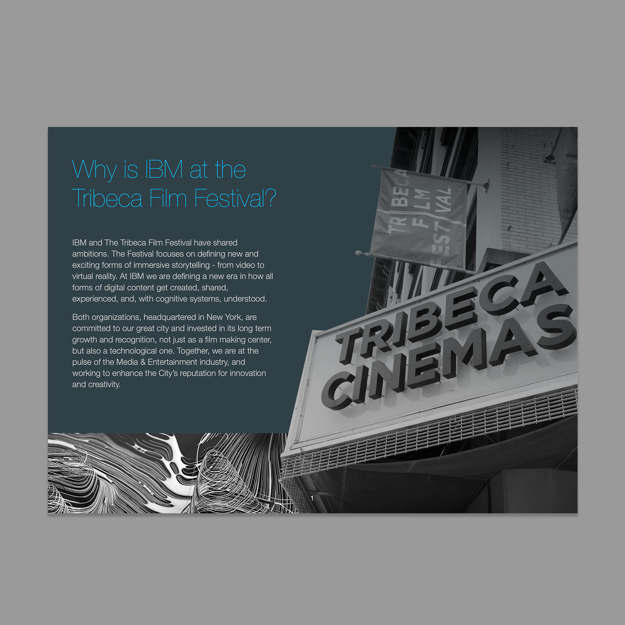 As an exhibitor and technology partner for the Tribeca Film Festival, IBM pitched a sophisticated setup, featuring a lounge, bar, interactive lobby display area and a private screening room.